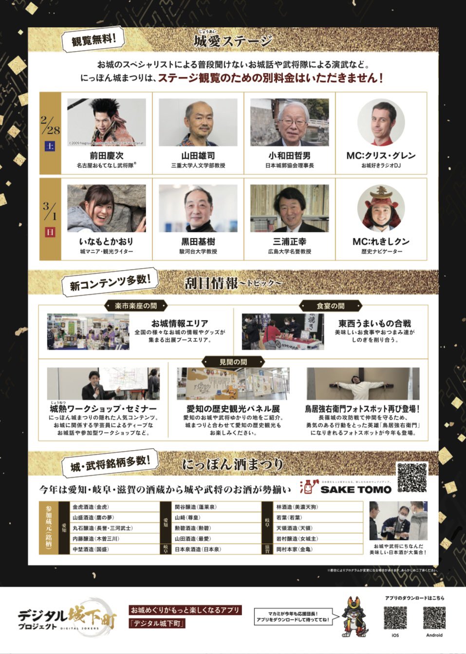 全国の様々なお城の情報や限定グッズが集まる「お城情報エリア」をはじめ、展示コーナー、グルメ・地酒の販売、お城のスペシャリストによるトークショー、武将隊による演武など、多くの方に楽しんでいただけるイベントです。