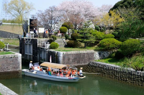 ボランティアガイドの説明を聞きながら観光船で巡ります。日本の小パナマ運河「船頭平閘門」(国指定重要文化財)では、川の水面の高さ調節を実際に体感いただけます。